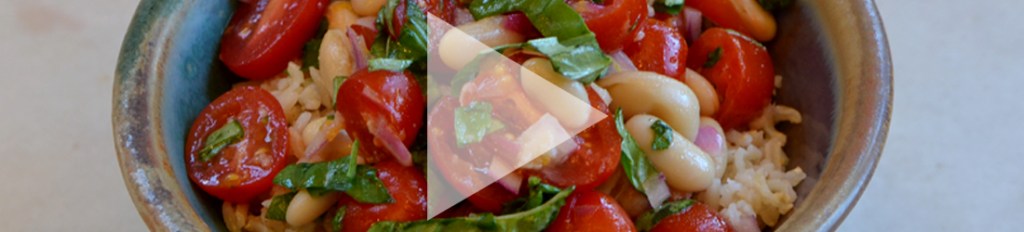 This dish is lovely, light, and summer. With the addition of the beans and rice, it becomes a complete protein and a very filling meal. Feel free to make this with whole, fresh tomatoes—just cut them up into bite-sized pieces. You can also use chickpeas or cannellini in place of the white kidney beans.