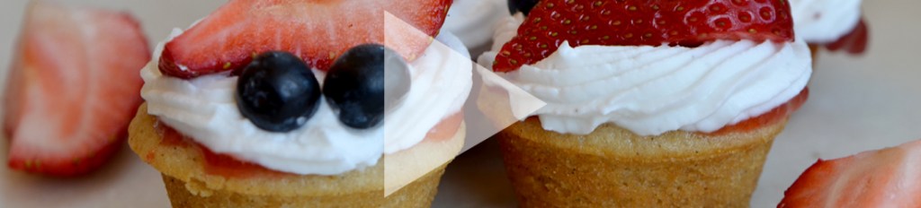 To serve, take a mini cupcake, spread a thin layer of jam atop, then a small blob of coconut whipped cream, and top with fresh strawberries.