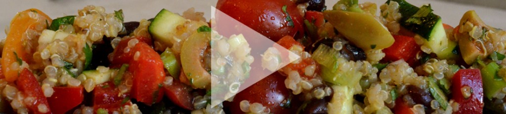 Combine quinoa (warm or cold is fine), cherry tomatoes, red pepper, zucchini, black beans, olives, green onions, and dressing. Lastly, add the fresh chopped mint and cilantro and taste for seasoning.